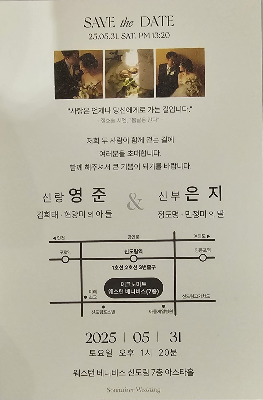 정도명(고34회) 동문 자녀 결혼, 2025년 5월31일(토) 오후 1시 20분, 웨스턴베니비스 신도림 7층 아스타홀
